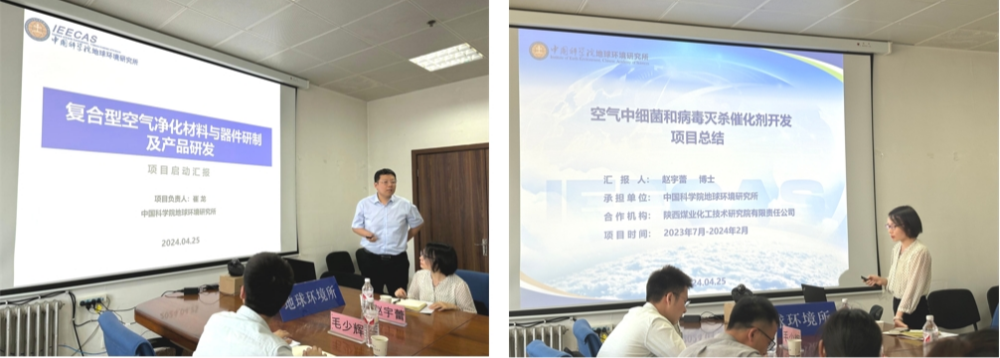 本次研讨旨在推进陕煤—秦岭计划项目的顺利实施,项目负责人崔龙汇报了项目研究内容、工作进展及下一步研究计划。赵宇蕾博士对结题项目“空气中细菌和病毒灭杀催化剂开发”进行了总结汇报。徐婕表示,陕煤—秦岭计划重点资助的材料领域与地环所空气净化材料科研方向紧密契合,对结题项目取得的成果给予充分肯定并将持续结合市场需求探索产业化路径。黄宇表示与陕煤集团的合作,有利于促进科技成果转化为新质生产力,全面释放创新驱动开展的原动力。